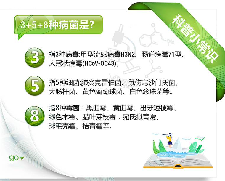 ◆3,指3種病毒:甲型流感病毒H3N2、腸道病毒71型、人冠狀病毒(HCoV-OC43)。◆5,指5種細菌:肺炎克雷伯菌、鼠傷寒沙門氏菌、大腸桿菌、黃色葡萄球菌、白色念珠菌等。