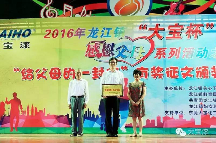 5月20日,由佛山龍江鎮(zhèn)教育局、龍江鎮(zhèn)關(guān)心下一代委員會(huì)與大寶漆共同主辦的2016年龍江鎮(zhèn)“大寶杯”感恩父母系列活動(dòng)之“給父母的一封信”有獎(jiǎng)?wù)魑念C獎(jiǎng)典禮在龍江鎮(zhèn)城區(qū)中心小學(xué)舉辦。佛山龍江鎮(zhèn)教育局和龍江鎮(zhèn)關(guān)心下一代委員會(huì)在頒獎(jiǎng)典禮上授予大寶漆“博愛(ài)慈懷熱心公益”稱號(hào)。大寶化工企劃部楊忠榮副理、龍江鎮(zhèn)關(guān)心下一代工作委員會(huì)麥煥橋主任、獲獎(jiǎng)小學(xué)生及其家長(zhǎng)出席了本次頒獎(jiǎng)典禮。