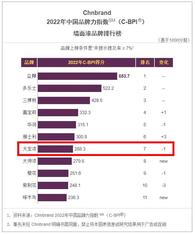 4月20日,品牌評級權(quán)威機構(gòu)Chnbrand發(fā)布2022年(第十二屆)中國品牌力指數(shù)SM(C-BPI®)品牌排名和分析報告,大寶漆再次憑借優(yōu)質(zhì)、環(huán)保的產(chǎn)品與深厚的研發(fā)實力和口碑上榜。