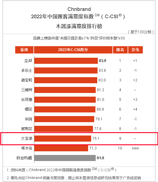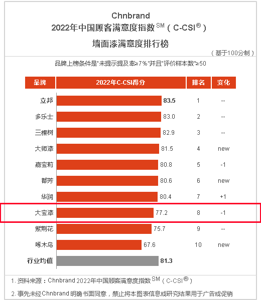 彰顯品牌韌性|大寶漆再度上榜中國顧客滿意度指數排行榜