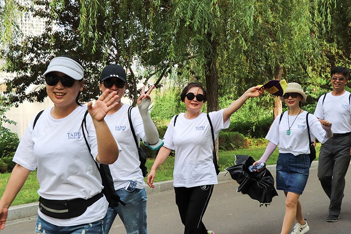 在工作人員的指引下,參賽隊伍高舉印有“大寶漆,品質(zhì)光彩生活”的旗幟徐徐前進,形成一道道亮麗的風景線。長長的隊伍從起點出發(fā),沿途,大寶漆工作人員為參賽者準備了飲用水補給,運動愛好者們一路走走拍拍,用腳步和汗水感受運動的樂趣。