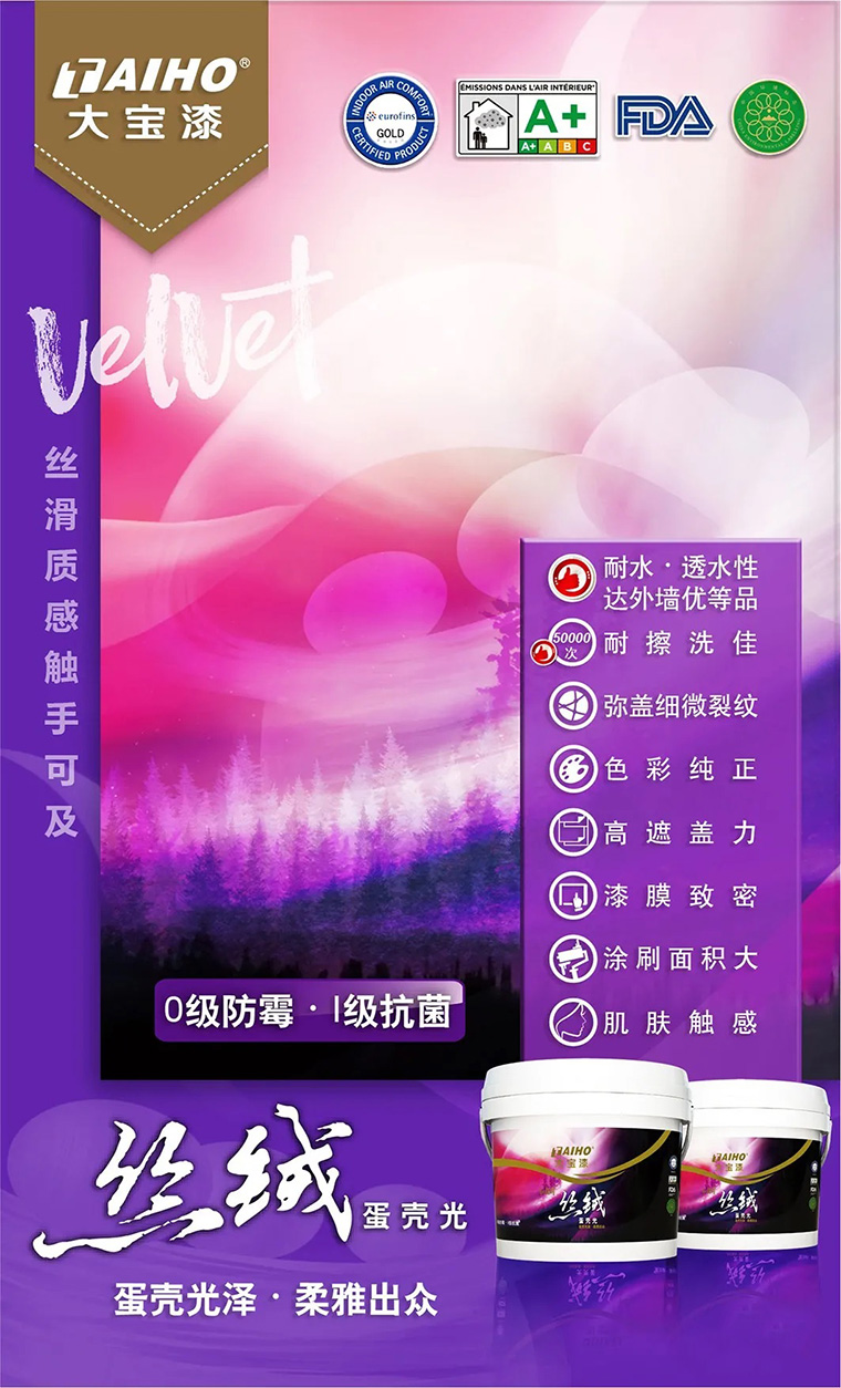大寶絲絨蛋殼光親膚觸感,給家全新視覺體驗。采用國際品牌優質原料,結合凈味技術和創新『肌膚觸感墻面體驗』及獨特的工藝精心研制。涂刷后墻面呈現絲絨般光澤,不反光的柔雅質感,同時漆膜致密飽滿、親膚觸感與視覺效果完美統一,同時符合多項國際環保認證,為家打造全新的視覺盛宴和居家體驗。