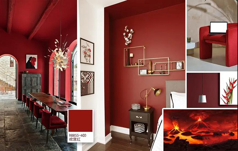相較普通紅色,故宮紅多了一份熱情,同時又多了份莊嚴,這個色彩背后蘊藏著或許是希望,是勇敢,若擔心故宮紅的色調太過豐富飽滿,可適當添入綠植、黃銅元素、木制/半透明軟裝、用其他色調組成的壁畫/織物/燈具等等進行中和,更能呈現出現代時尚感,是年輕一代大膽創新的選擇,更是不落俗套的詮釋。